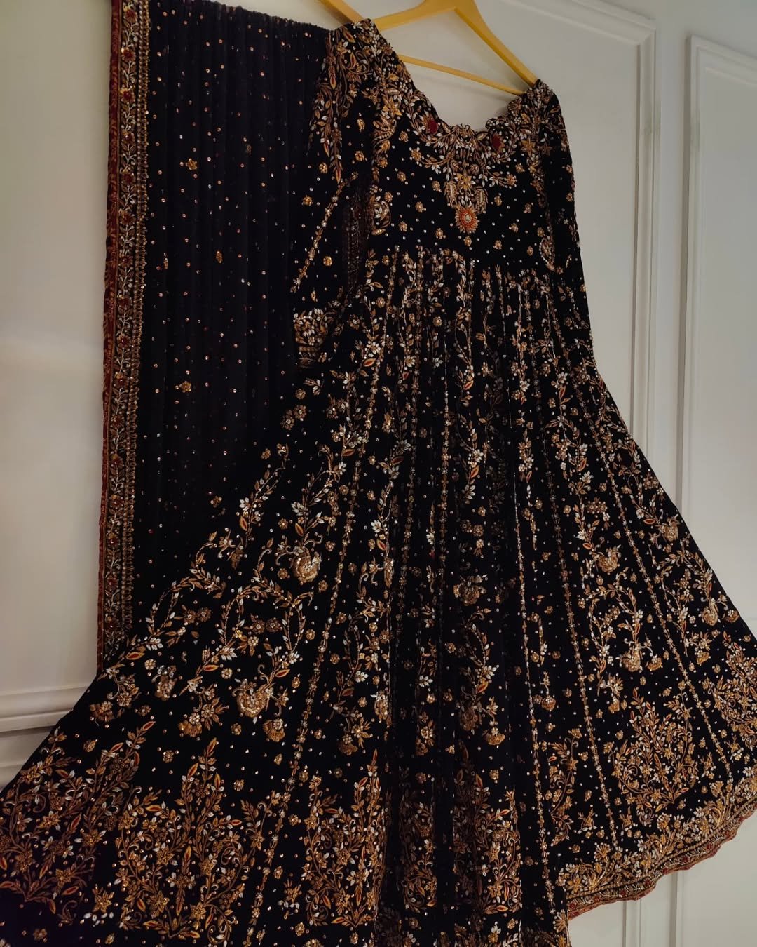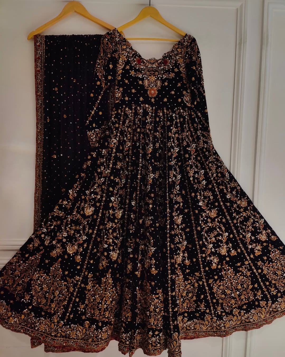 The dress is paired with a matching dupatta finished with embellished borders, adding charm and elegance. Crafted with premium fabric and intricate work, this piece reflects luxury while being easy to carry for long events.