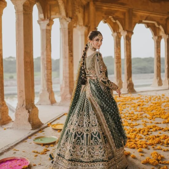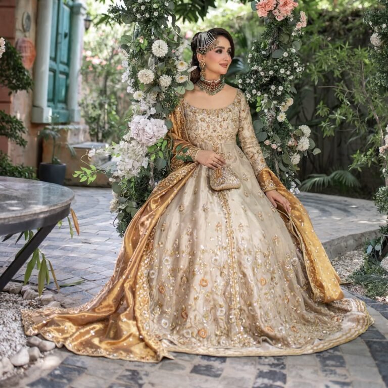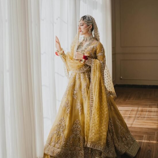 This ivory gold bridal lehenga is a masterpiece of elegance and craftsmanship. Adorned with hand embroidery, zari, sequins, crystals, and delicate resham work, this dress offers a royal yet modern bridal look. The lehenga features a flowing silhouette with intricate detailing, paired with a heavily embellished dupatta for a regal finish. Perfect for weddings, receptions, and grand bridal events, this outfit blends tradition with timeless sophistication.