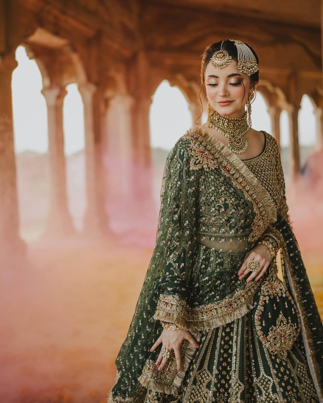 This emerald green bridal lehenga is designed for brides who want a regal and unforgettable look. The lehenga is crafted with intricate antique gold embroidery, zari work, sequins, and hand embellishments, creating a luxurious contrast against the deep green base. The wide flare and detailed borders highlight craftsmanship at its finest, giving the bride a grand and majestic presence.