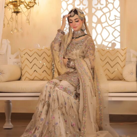 Luxury Bridal Sharara Set in Champagne Gold – Hand Embroidered with Multi-Color Detailing