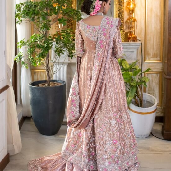 Luxury Bridal Embroidered Lehenga – Rose Gold with Pink Floral Accents